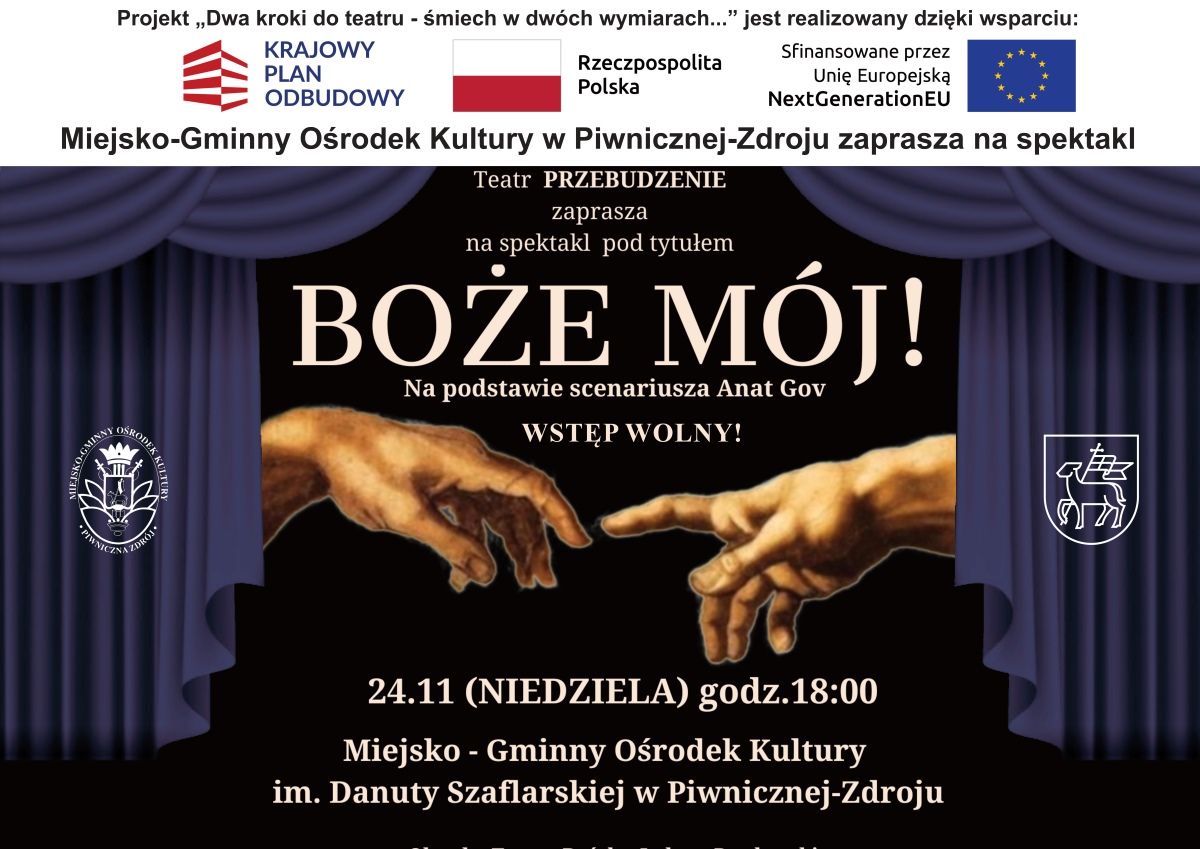 24 listopada /niedziela/ o godzinie 18:00 mamy przyjemność zaprosić Państwa na spektakl "Boże mój" w wykonaniu Teatru Przebudzenie" 😇