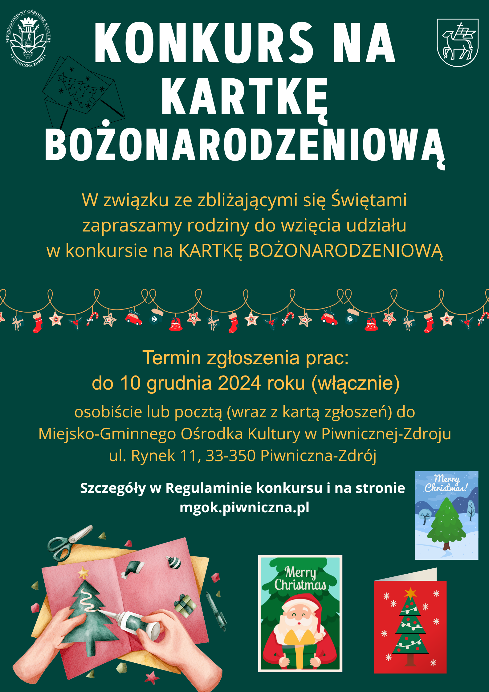 Serdecznie zapraszamy do udziału w konkursie na Kartkę Bożonarodzeniową - oprócz nagród rzeczowych zwycięska kartka zostanie wysłana z życzeniami od Miejsko-Gminnego Ośrodka Kultury do innych instytucji kultury :)