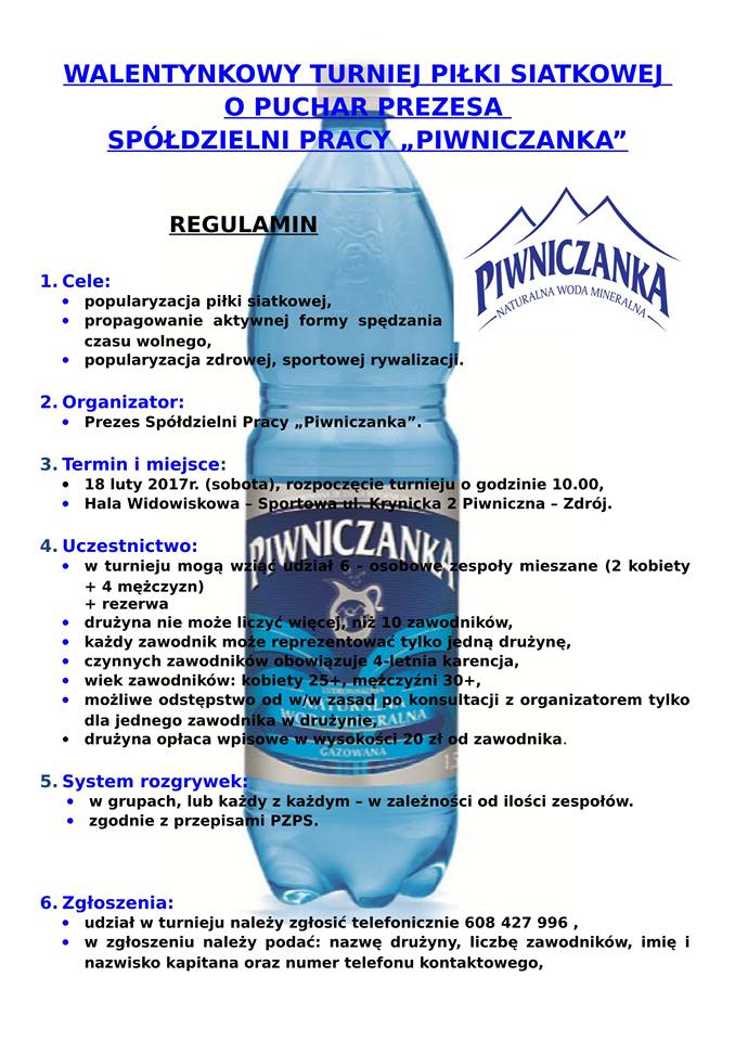 Drukuj Powrót do poprzedniej strony Walentynkowy Turniej Piłki Siatkowej o Puchar Prezesa Spółdzielni Pracy Piwniczanka 18.02.2017 10:00 Treść